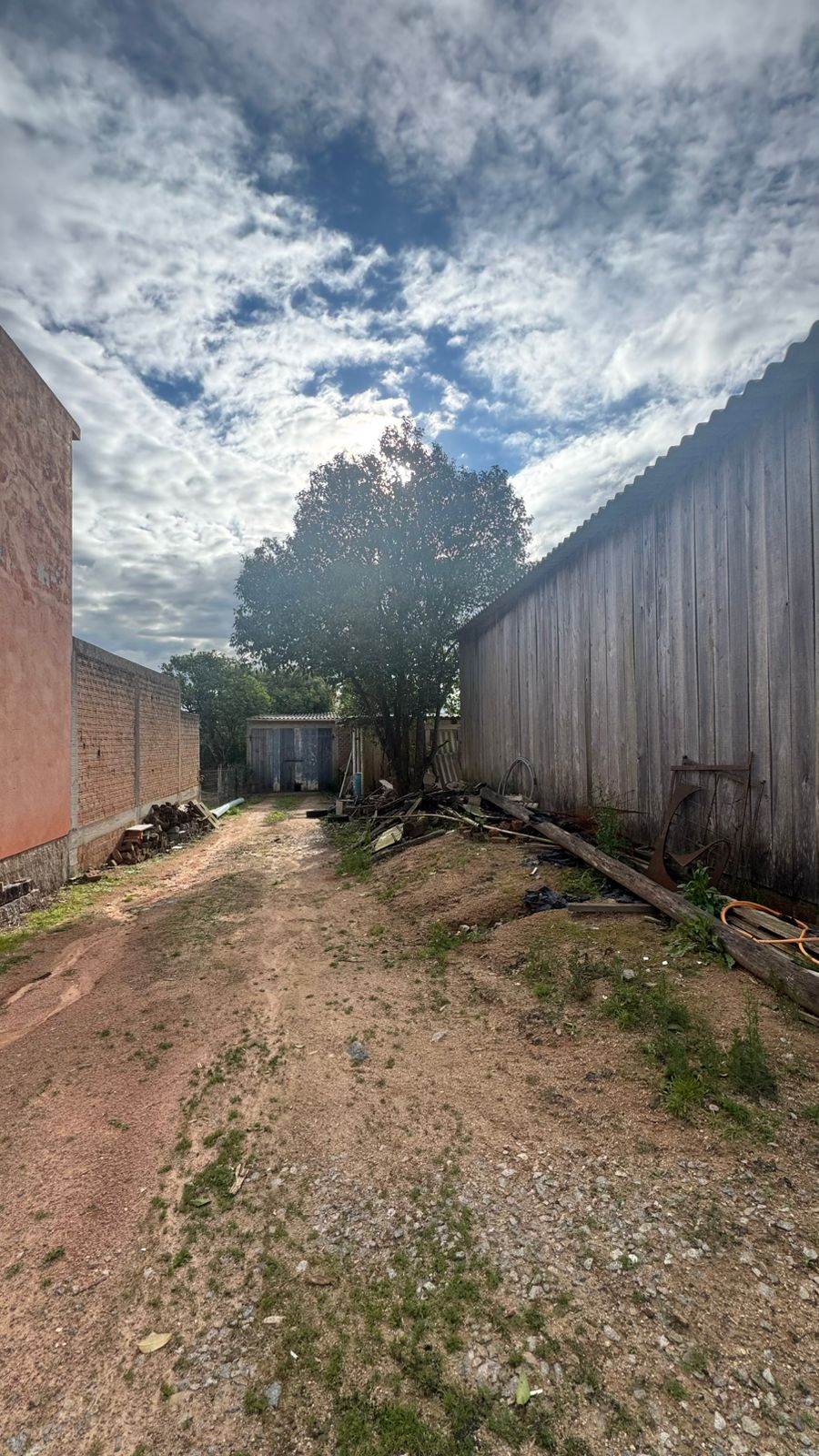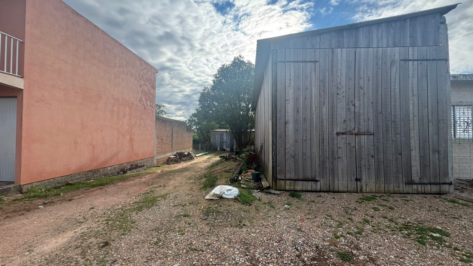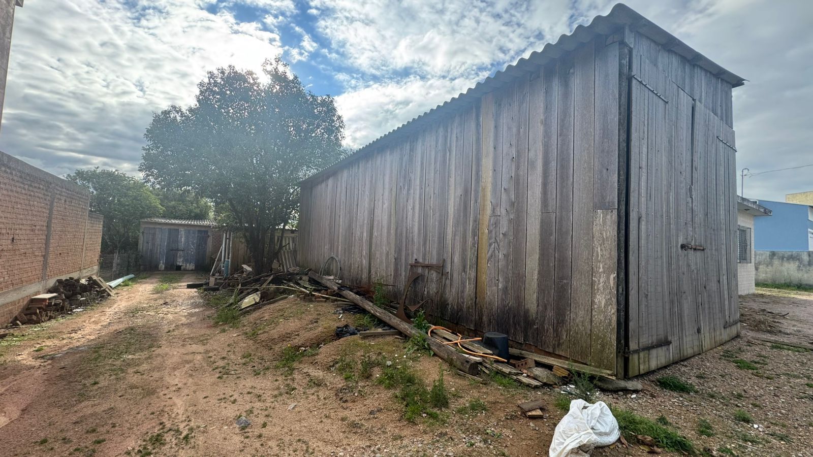Imóvel composto por terreno de superfície regular, com solo firme e área livre ao redor da construção. No local está edificado um galpão em madeira medindo aproximadamente 10,5 metros de frente por 28 metros de fundo.